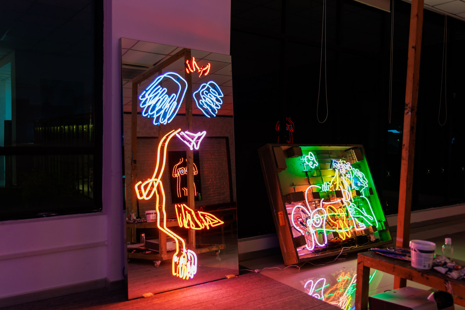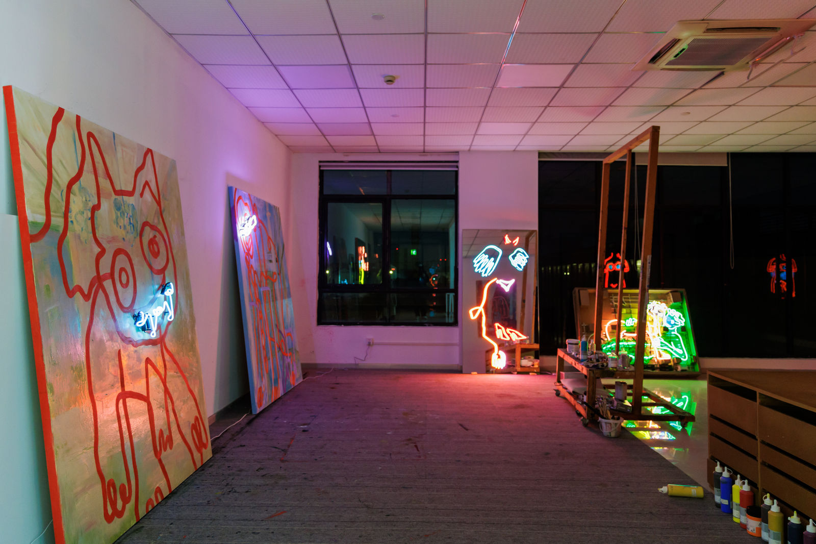 During this residency, Anna Nezhnaya further explored the creative possibilities of neon as a medium. Beginning with digital painting, she translated the lines and colors from the screen into physical paintings and neon installations, continuously constructing a dual narrative of vision and perception through material transformation. Through the interplay of light, form, and space, she extended her ongoing exploration of mythological themes and identity, achieving a reweaving of visual language and interia of images.